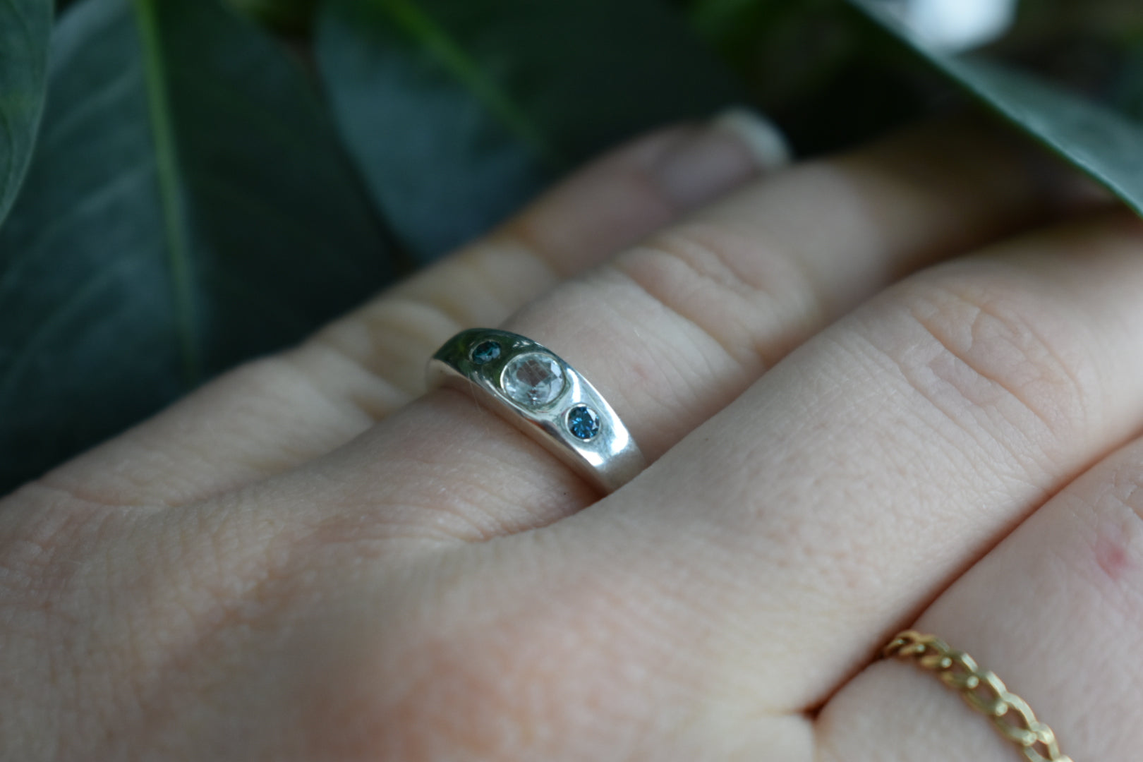 Bague en taille 52 ornée d’un Saphir du Montana légarement bleutée de 4,5mm et de deux Diamants bleus de 2,6mm, une bague entièrement réalisée à la main en argent 925, taillée dans la masse — sans moulage, sans cire perdue, avec une seule soudure dans la partie fine de l’anneau.